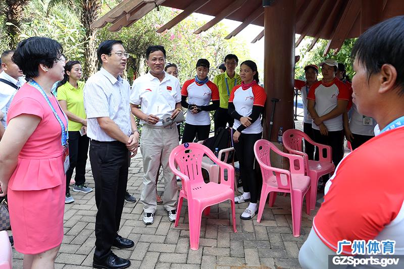 10月12日下午,参加完广东省第四届体育大会开幕式的广州代表团常务副团长、壹贰博-12bet壹贰博 局长罗京军和副团长、壹贰博-12bet壹贰博 副局长林燕芬及壹贰博-12bet壹贰博 副巡视员吴先浪等专程来到广东省第四届体育大会龙舟赛场所在地惠州市白露湖,看望慰问了正在这里备战和参赛的广州市龙舟运动队的运动员和教练员,勉励他们团结拼搏,赛出风格,赛出风采,赛出友谊,赛出水平。