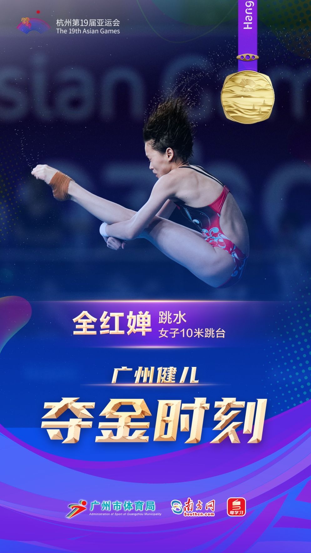 10月3日,在杭州亚运会跳水女子10米台决赛中,广州与湛江联合培养运动员全红婵在最后一跳逆风翻盘,最终以总分438.20分夺得冠军。值得一提的是,在全红婵的第二跳中,现场7名裁判全都打出了10分。这是广州运动员在本届亚运会取得的第七枚金牌。